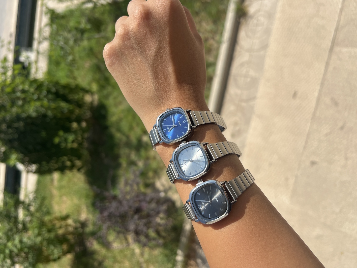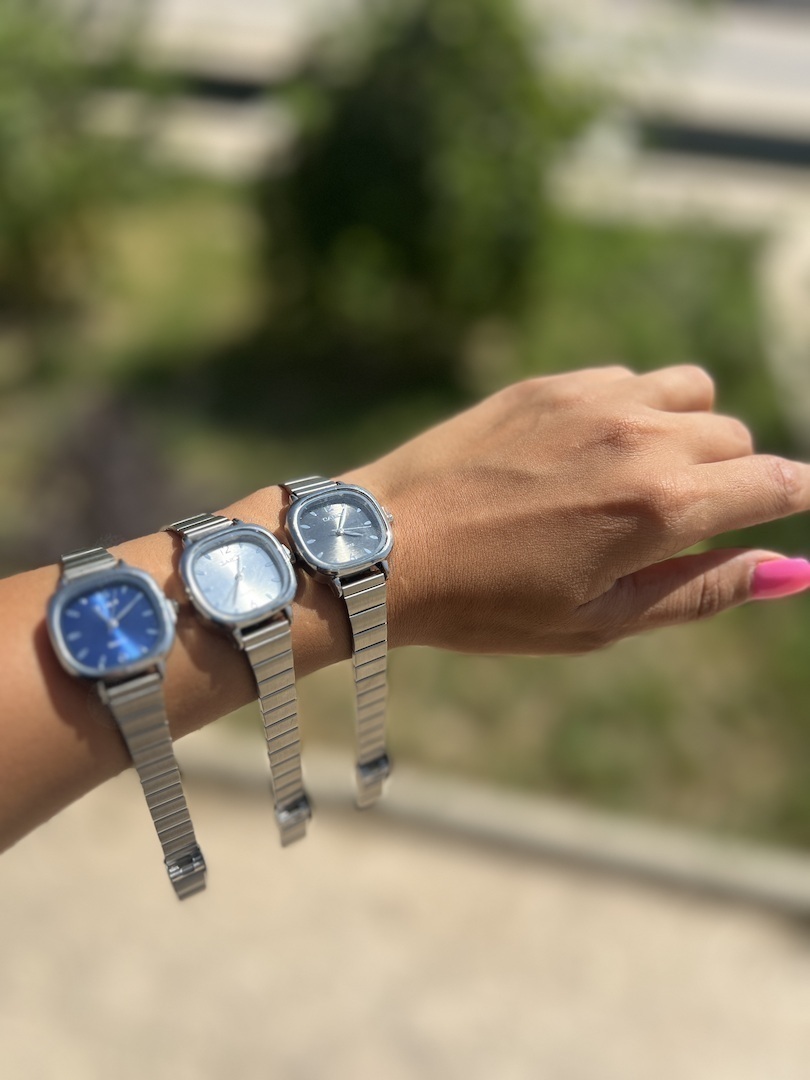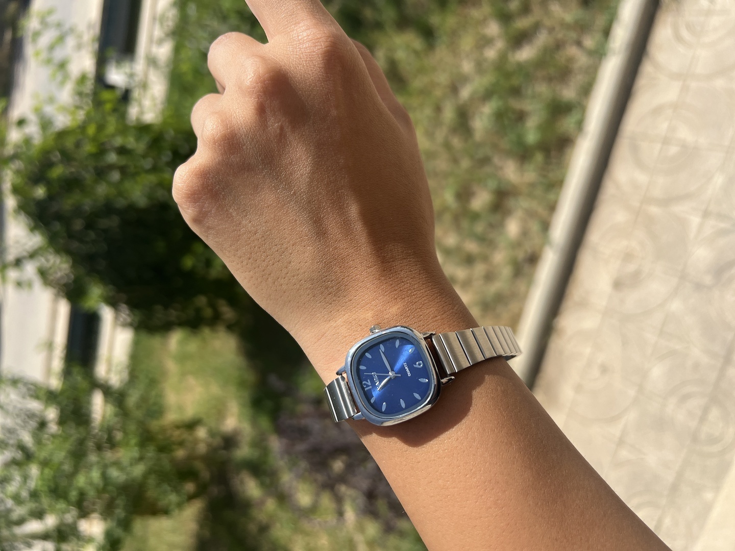 با صفحهٔ صیقلی دودی براق ،نقره ای ،سورمه ای متالیک و بند فلکسی، گزینه ای ظریف و همه کاره برای خانم هایی است که ساعت سبک و کم حاشیه می پسندند. طراحی ساده و روشن صفحه خوانایی بالا را فراهم می کند و بند فلکسی راحتی استفاده را افزایش می دهد. ترکیب استیل رنگ ثابت و موتور کوارتز، تعادل خوبی بین دوام و دقت ارائه می دهد. نکات نگهداری: از تماس با آب داغ و مواد اسیدی خودداری کنید و در صورت نیاز بند را با پارچه مرطوب و خشک پاک کنید.
