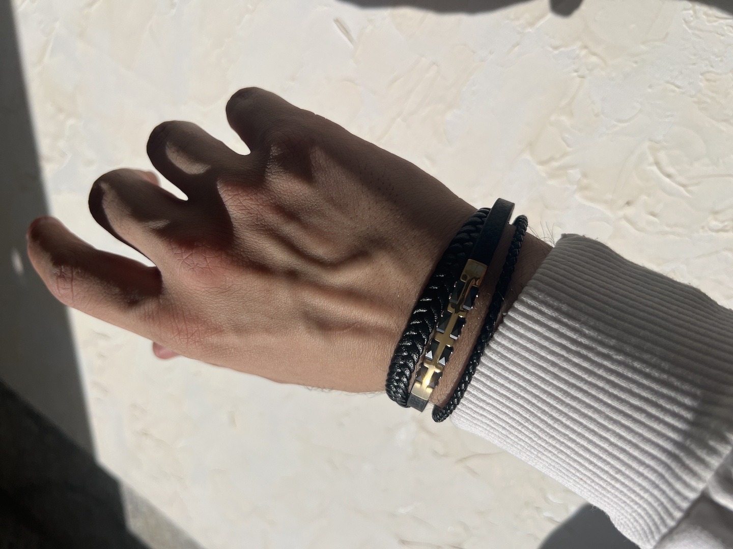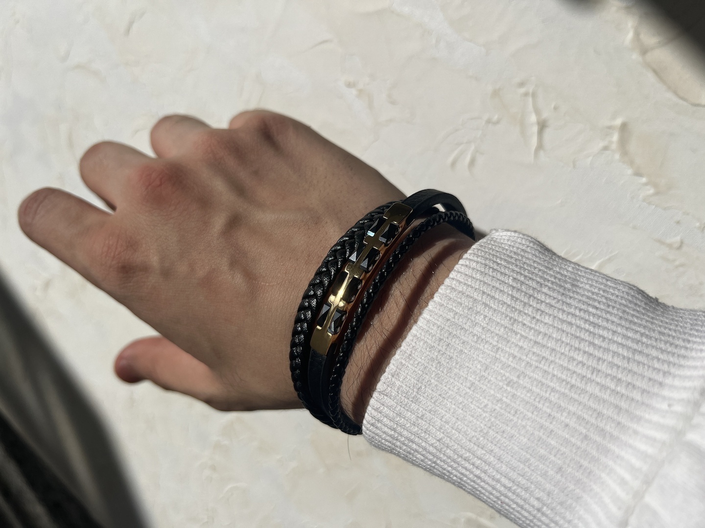 «سه رج چرمی» یک دستبند مردانهٔ خوش ساخت است که سه رشته بند چرمی را با یک پلاک استیل طلاییِ براق ترکیب می کند. این طراحی چندلایه جلوه ای مدرن و مردانه دارد و به خوبی با تی شرت و پیراهن یقه دار قابل ست شدن است. روکش استیل به کار رفته رنگ ثابتی دارد و در استفادهٔ روزمره در برابر تعریق و تماس معمول مقاوم است. قفل محکم و ساختار انعطاف پذیر بند، پوشیدن و درآوردن را ساده می کند و طول قابل تنظیم آن برای اغلب مچ ها مناسب است. برای حفظ جلوهٔ اولیه، توصیه می شود از تماس طولانی با آب، عطر یا مواد شوینده خودداری شود و برای تمیزکاری از پارچهٔ نرم و خشک استفاده کنید. این مدل گزینه ای عالی برای هدیهٔ روز پدر، تولد یا استایل روزمرهٔ مردان شیک پوش است