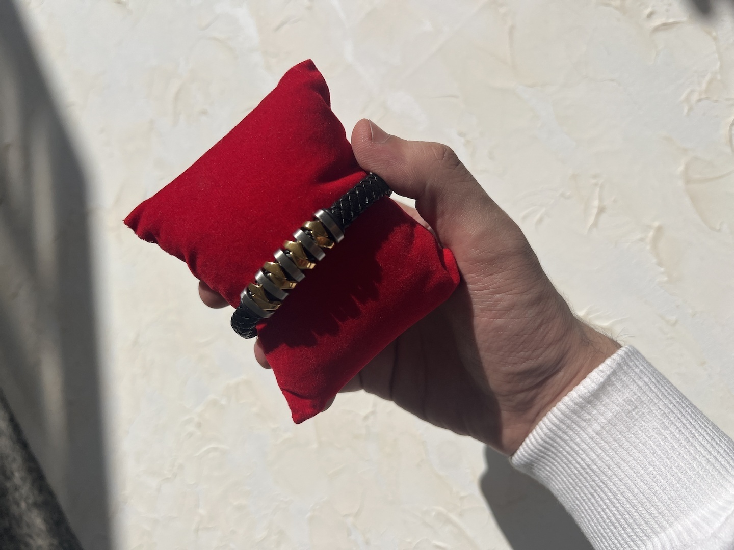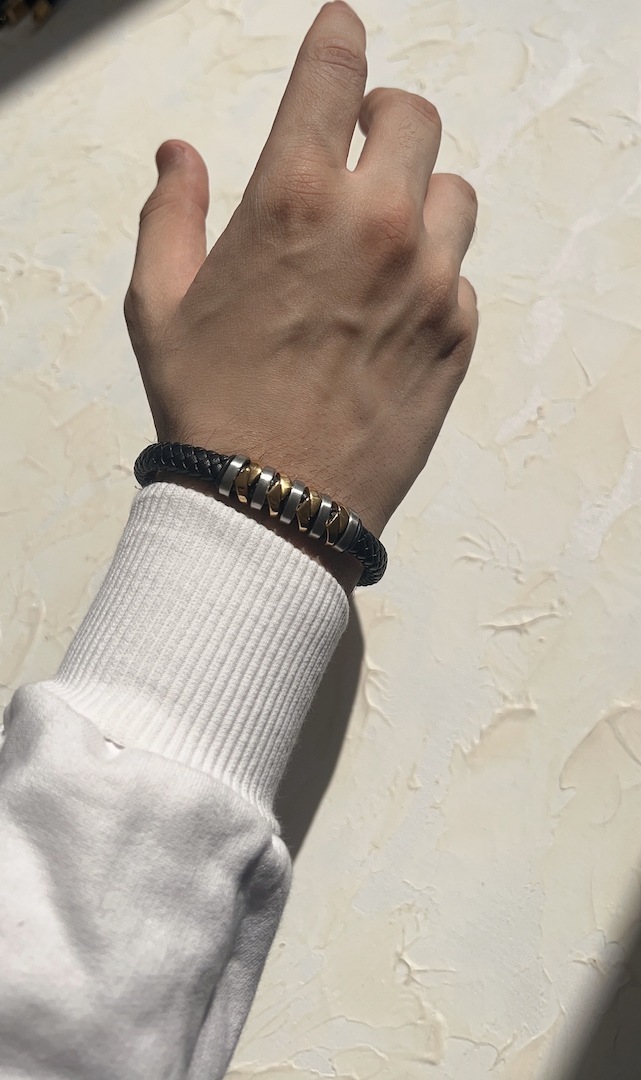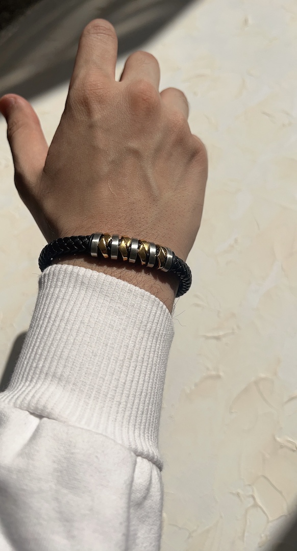 «رسای سلطنتی» دستبندی است که با بازی با بافت چرم و برجسته سازی فلز، حس قدرتمند و باوقاری به استایل می بخشد. مهره های استیل به صورت متناوبِ طلایی و نقره ای کار شده اند تا انعطاف بصری ایجاد کنند و امکان ست کردن با ساعت یا انگشتر را فراهم نمایند. این مدل برای آقایانی مناسب است که به جزئیات و ترکیب رنگ ها در اکسسوری اهمیت می دهند و می خواهند در ست های روزمره یا حضور در مهمانی ها، جلوه ای متفاوت داشته باشند